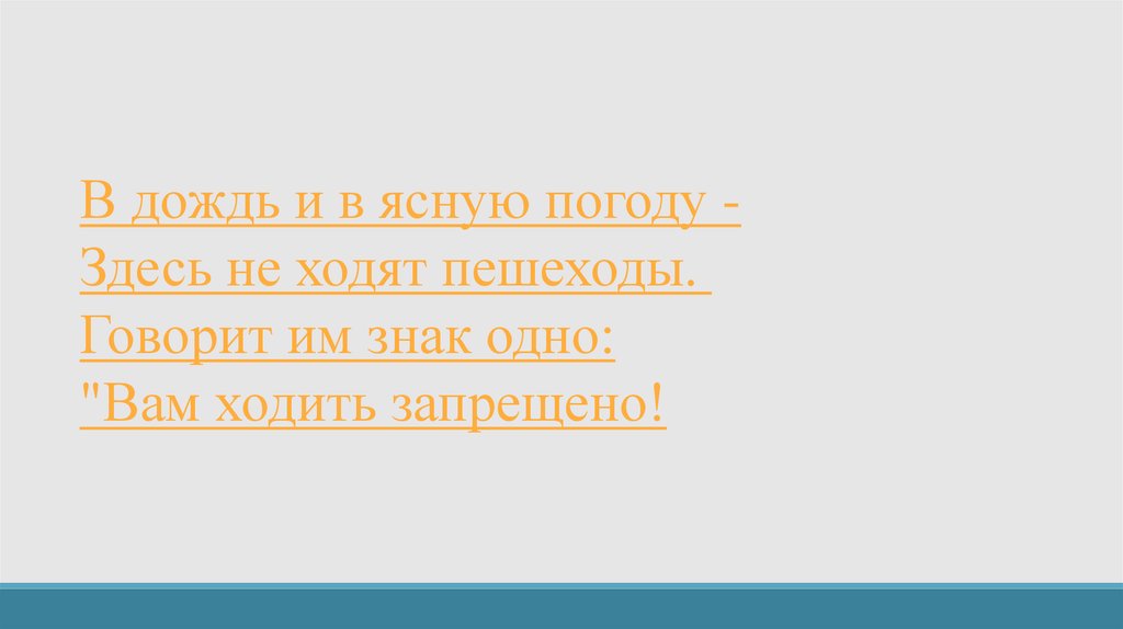 В дождь и в ясную погоду Здесь не ходят пешеходы.Говорит им знак одно: