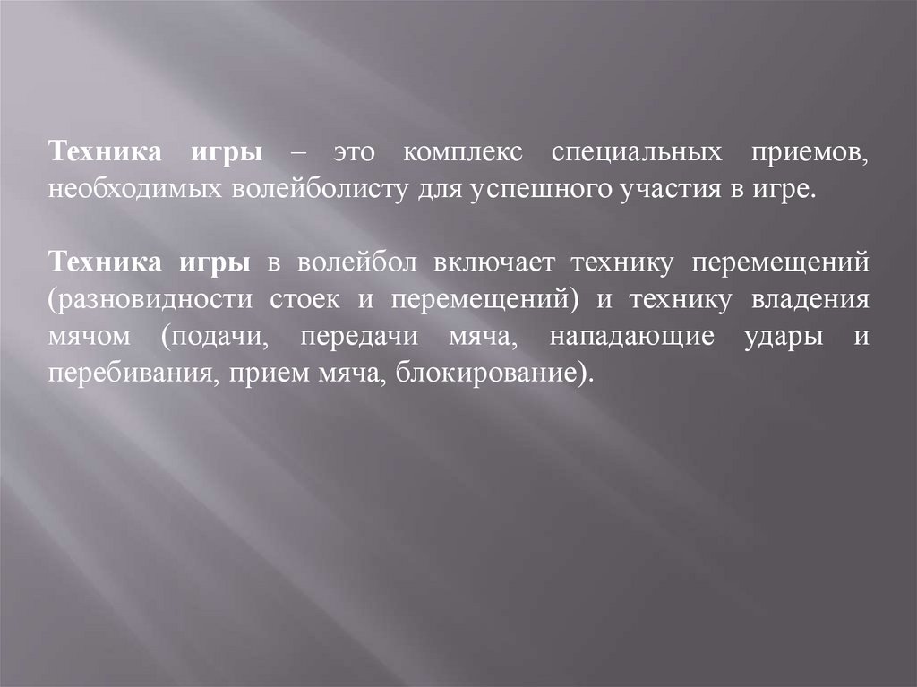 Техника игры – это комплекс специальных приемов,необходимых волейболисту для успешного участия в игре.