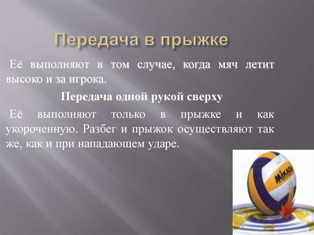 Её выполняют в том случае, когда мяч летитвысоко и за игрока.