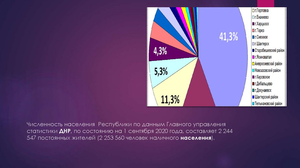 Численность населения Республики по данным Главного управлениястатистики ДНР, по состоянию на 1 сентября 2020 года, составляет 2 244