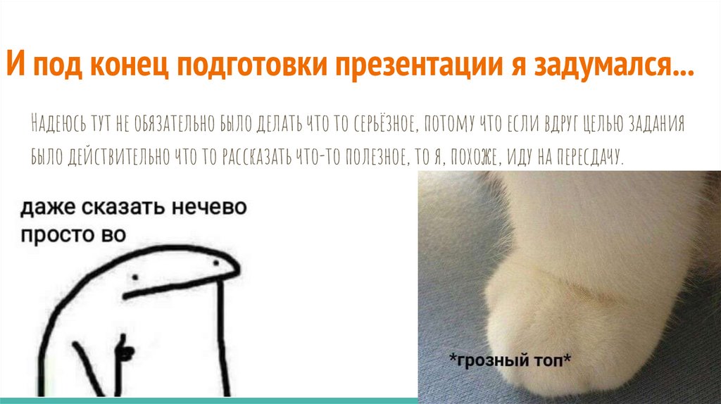 И под конец подготовки презентации я задумался...Надеюсь тут не обязательно было делать что то серьёзное, потому что если вдруг целью задания