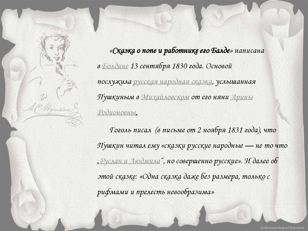«Сказка о попе и работнике его Балде» написанав Болдине 13 сентября 1830 года. Основой