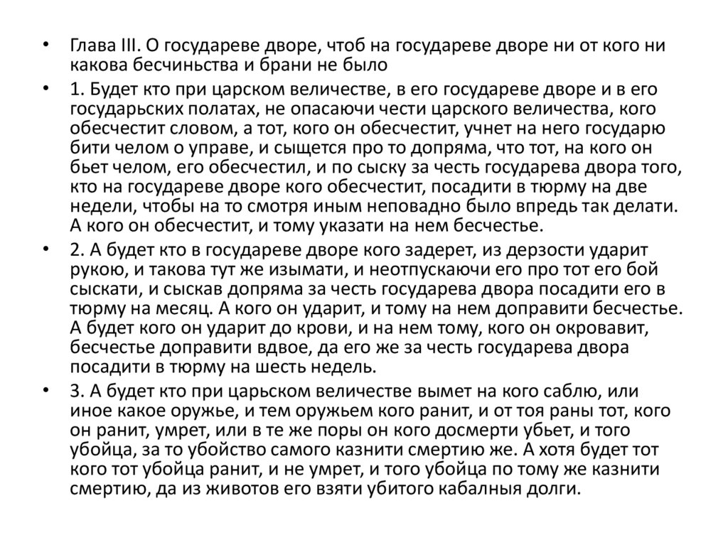 • Глава III. О государеве дворе, чтоб на государеве дворе ни от кого никакова бесчиньства и брани не было