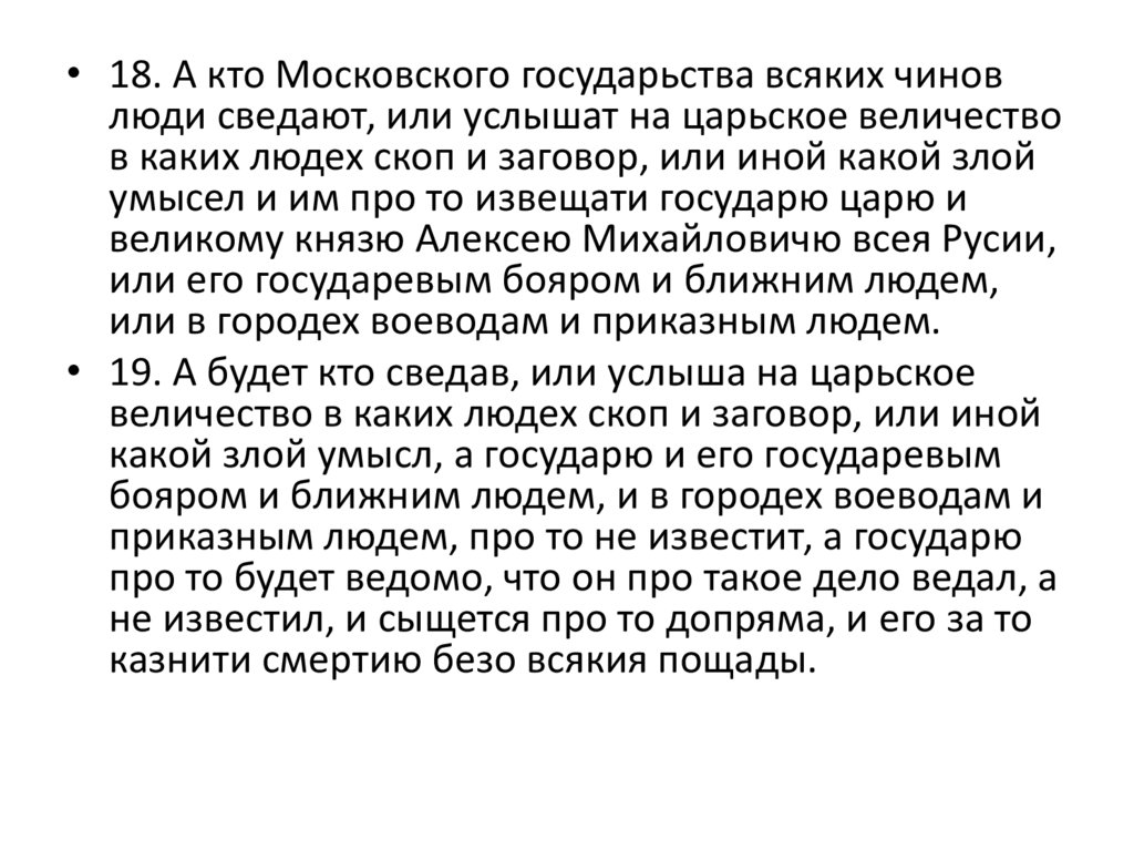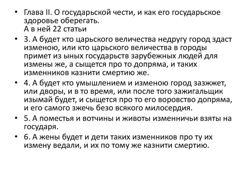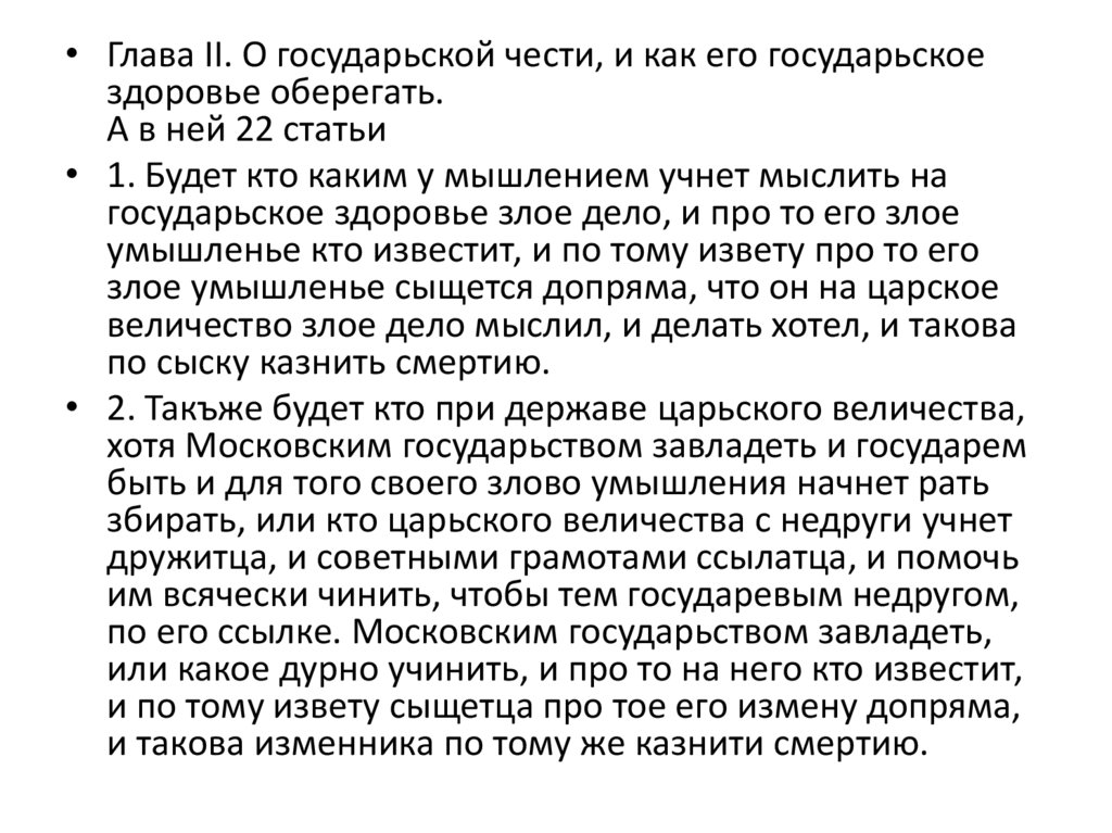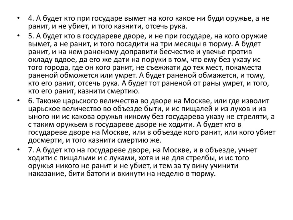 • 4. А будет кто при государе вымет на кого какое ни буди оружье, а неранит, и не убиет, и того казнити, отсечь рука.