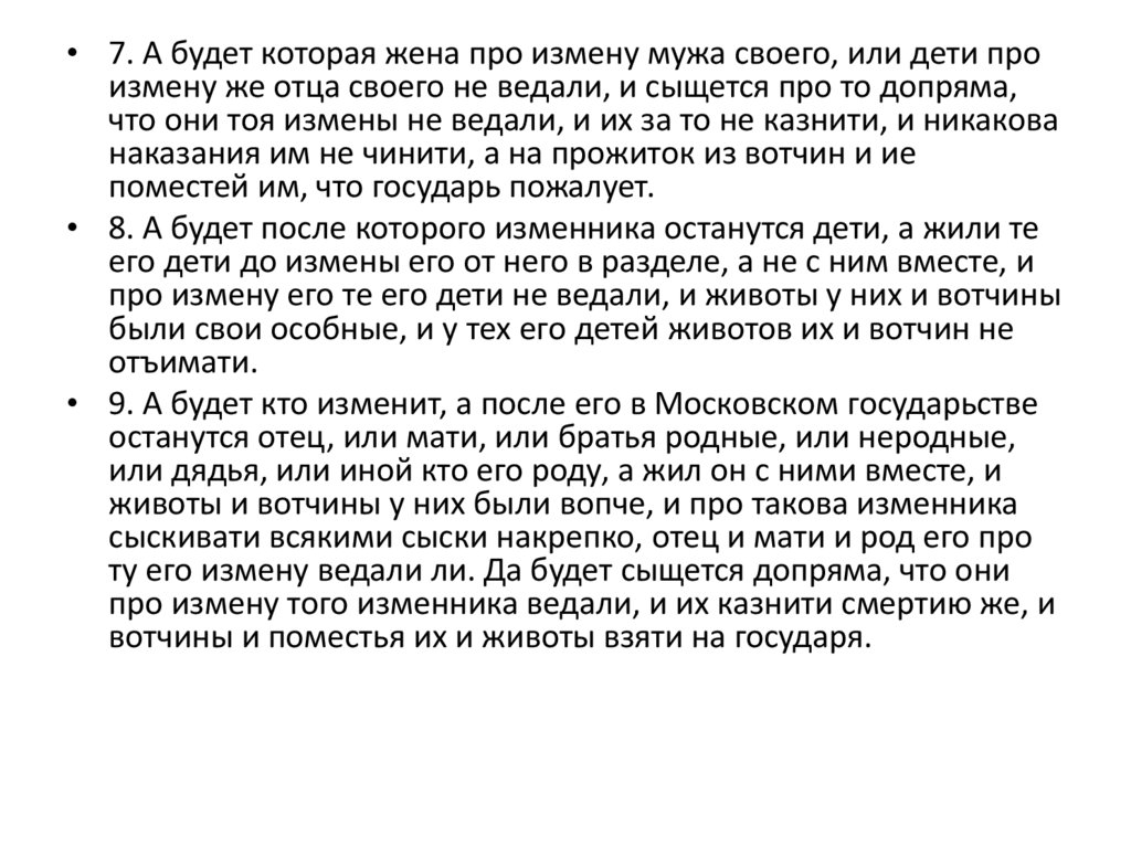 • 7. А будет которая жена про измену мужа своего, или дети произмену же отца своего не ведали, и сыщется про то допряма,