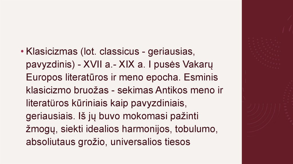 • Klasicizmas (lot. classicus - geriausias,pavyzdinis) - XVII a.- XIX a. I pusės Vakarų
