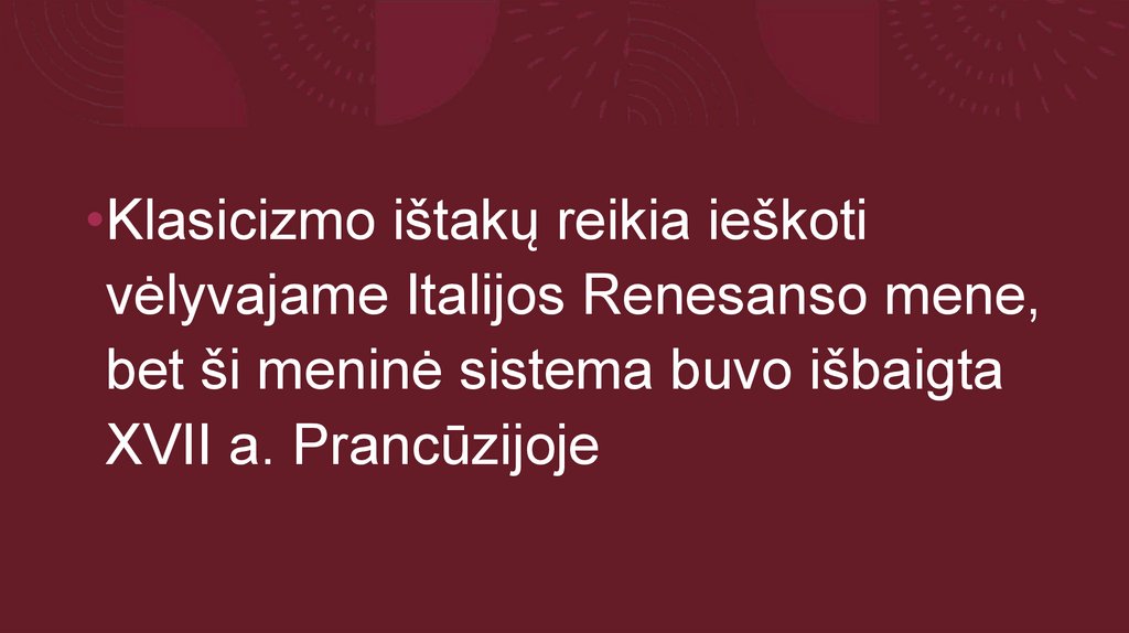 •Klasicizmo ištakų reikia ieškotivėlyvajame Italijos Renesanso mene,