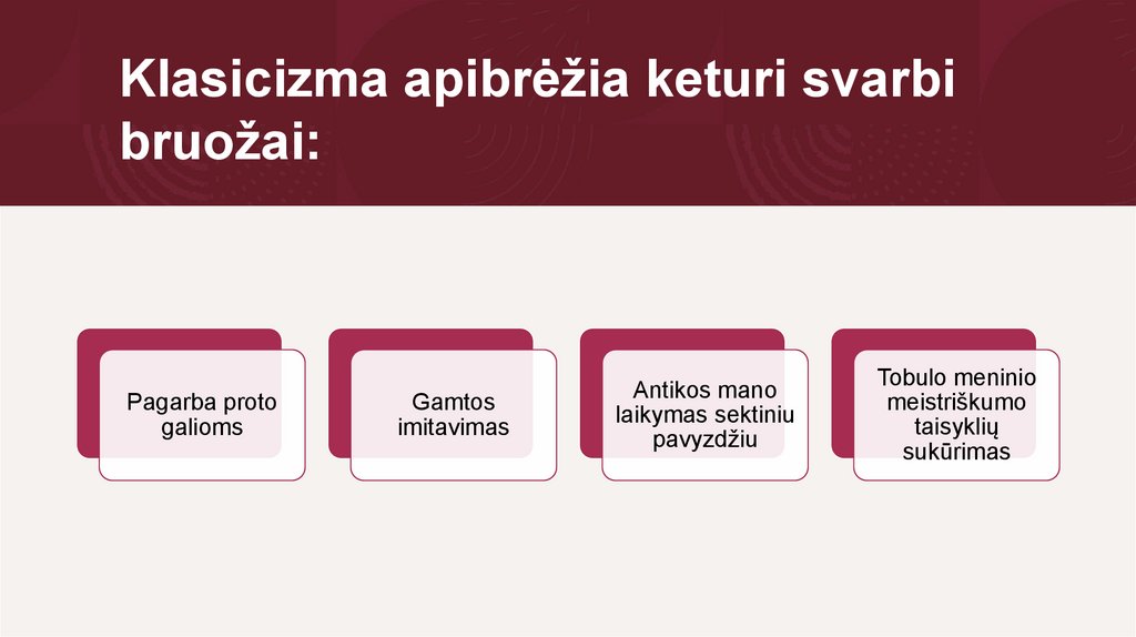 Klasicizma apibrėžia keturi svarbibruožai: