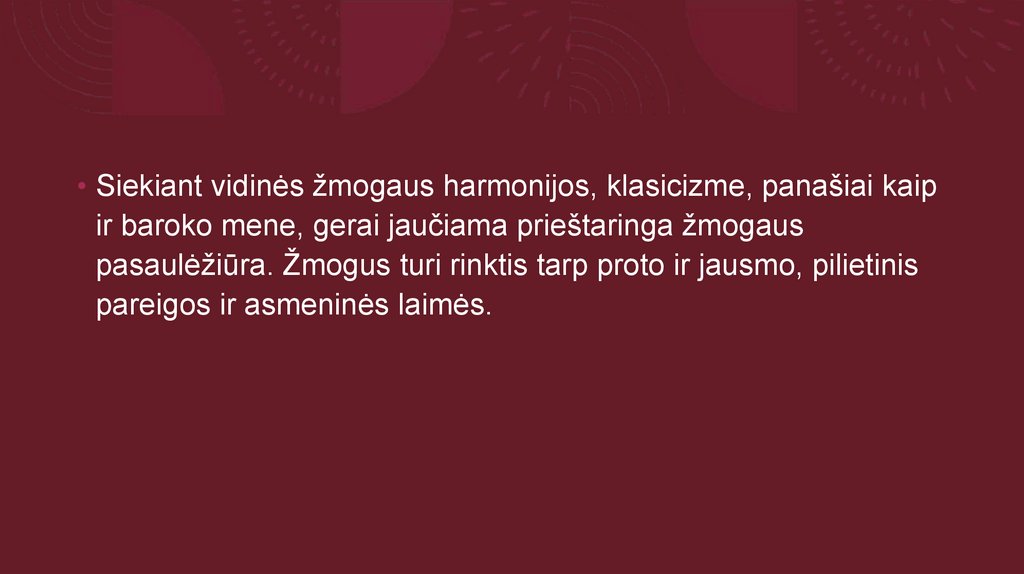 • Siekiant vidinės žmogaus harmonijos, klasicizme, panašiai kaipir baroko mene, gerai jaučiama prieštaringa žmogaus