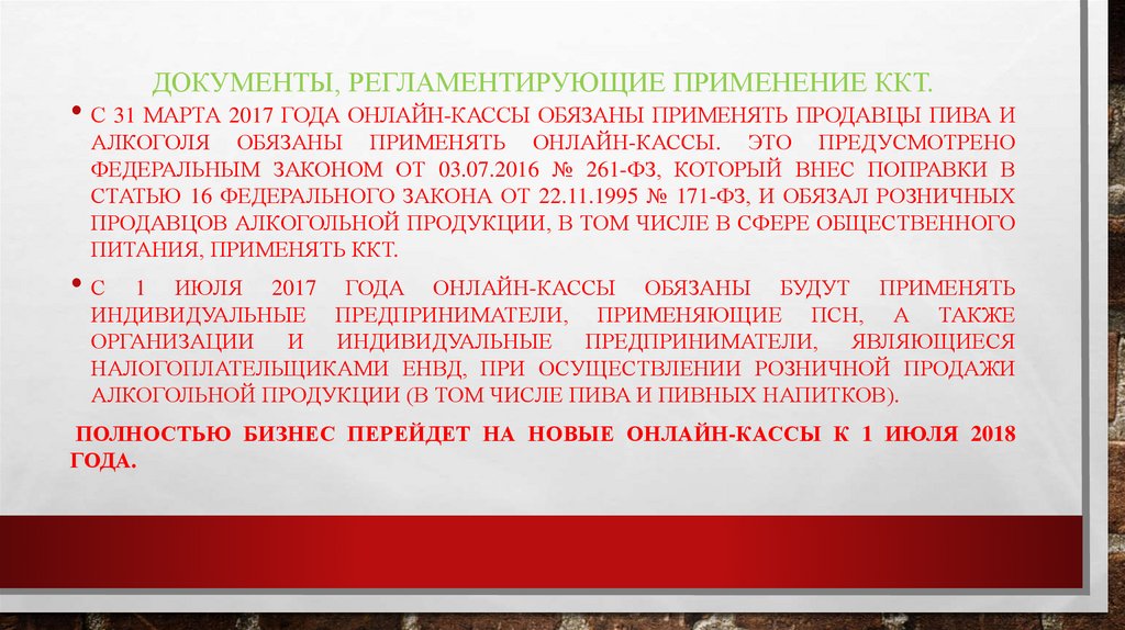 ДОКУМЕНТЫ, РЕГЛАМЕНТИРУЮЩИЕ ПРИМЕНЕНИЕ ККТ.• С 31 МАРТА 2017 ГОДА ОНЛАЙН-КАССЫ ОБЯЗАНЫ ПРИМЕНЯТЬ ПРОДАВЦЫ ПИВА И