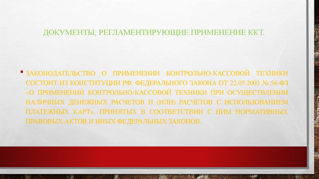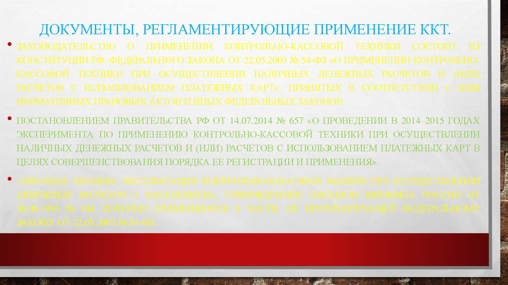 ДОКУМЕНТЫ, РЕГЛАМЕНТИРУЮЩИЕ ПРИМЕНЕНИЕ ККТ.• ЗАКОНОДАТЕЛЬСТВО