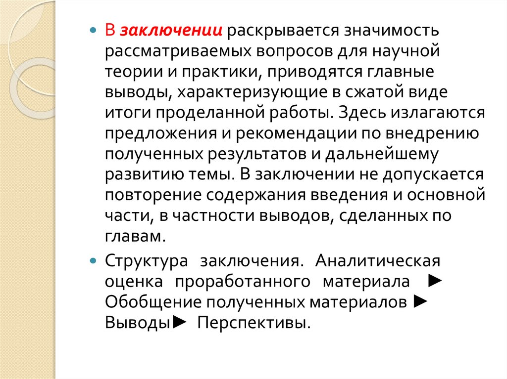 В заключении раскрывается значимостьрассматриваемых вопросов для научной