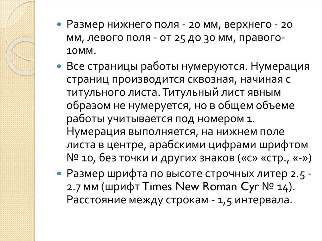 Размер нижнего поля - 20 мм, верхнего - 20мм, левого поля - от 25 до 30 мм, правого10мм.