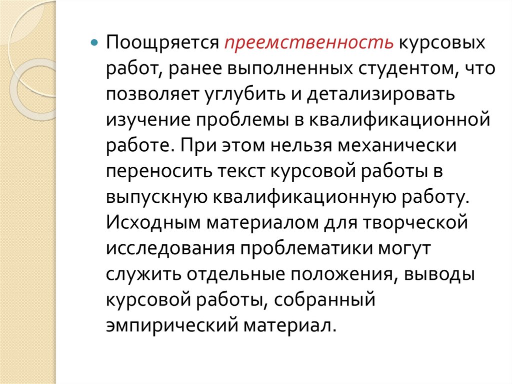 Поощряется преемственность курсовыхработ, ранее выполненных студентом, что