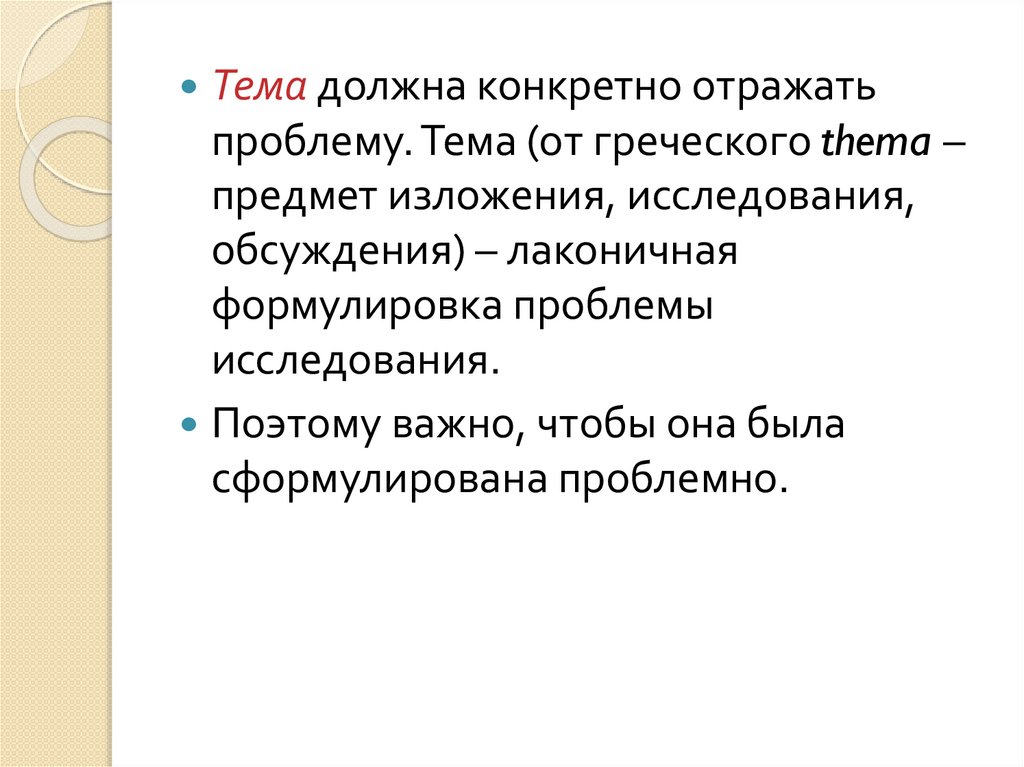 Тема должна конкретно отражатьпроблему. Тема (от греческого thema –