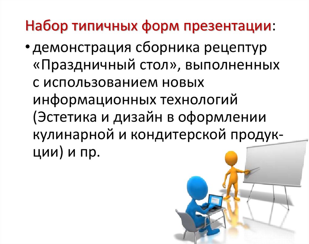 Набор типичных форм презентации:• демонстрация сборника рецептур