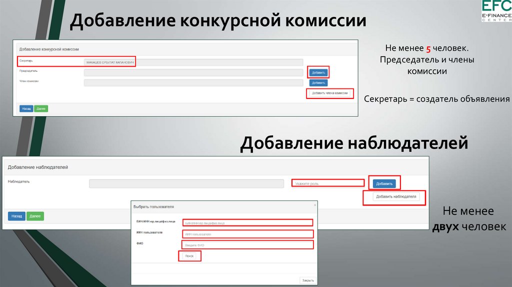 Добавление конкурсной комиссииНе менее 5 человек.