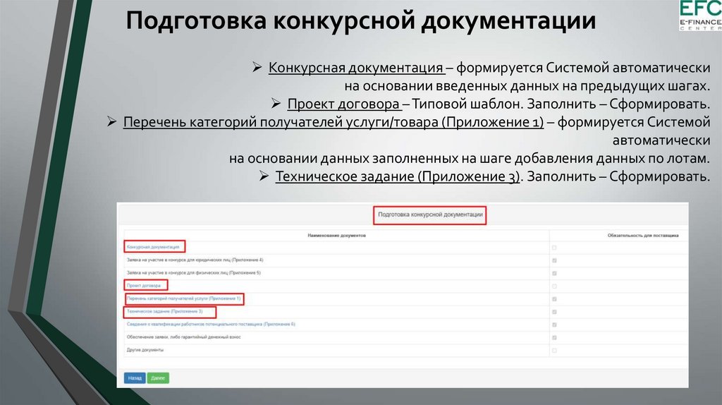 Подготовка конкурсной документацииКонкурсная документация – формируется Системой автоматически