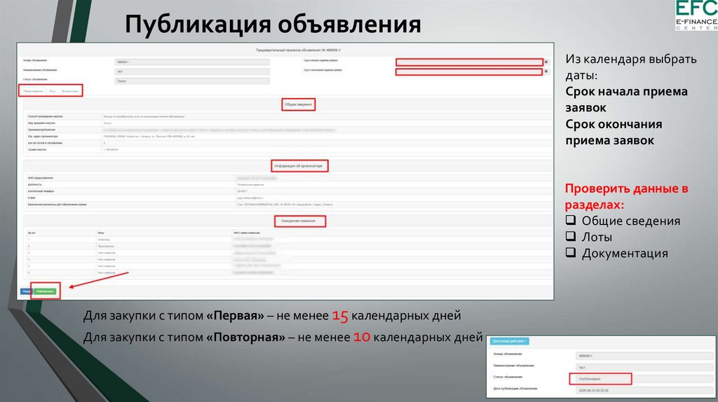 Для закупки с типом «Первая» – не менее 15 календарных дней