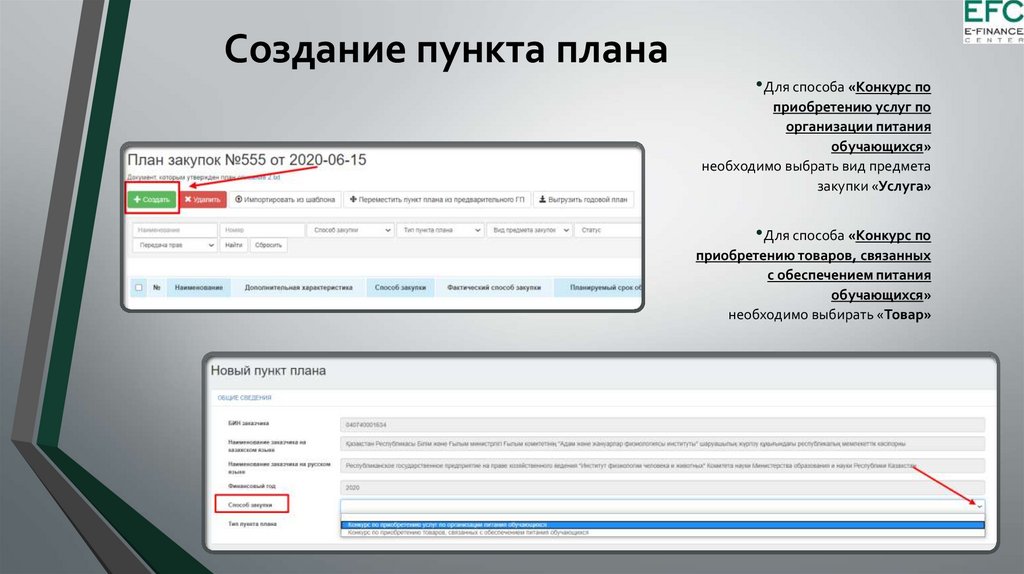 Создание пункта плана•Для способа «Конкурс по