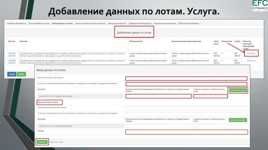 Добавление данных по лотам. Услуга.9.