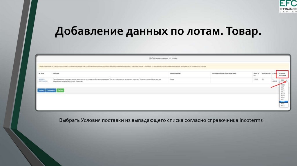Добавление данных по лотам. Товар.Выбрать Условия поставки из выпадающего списка согласно справочника Incoterms