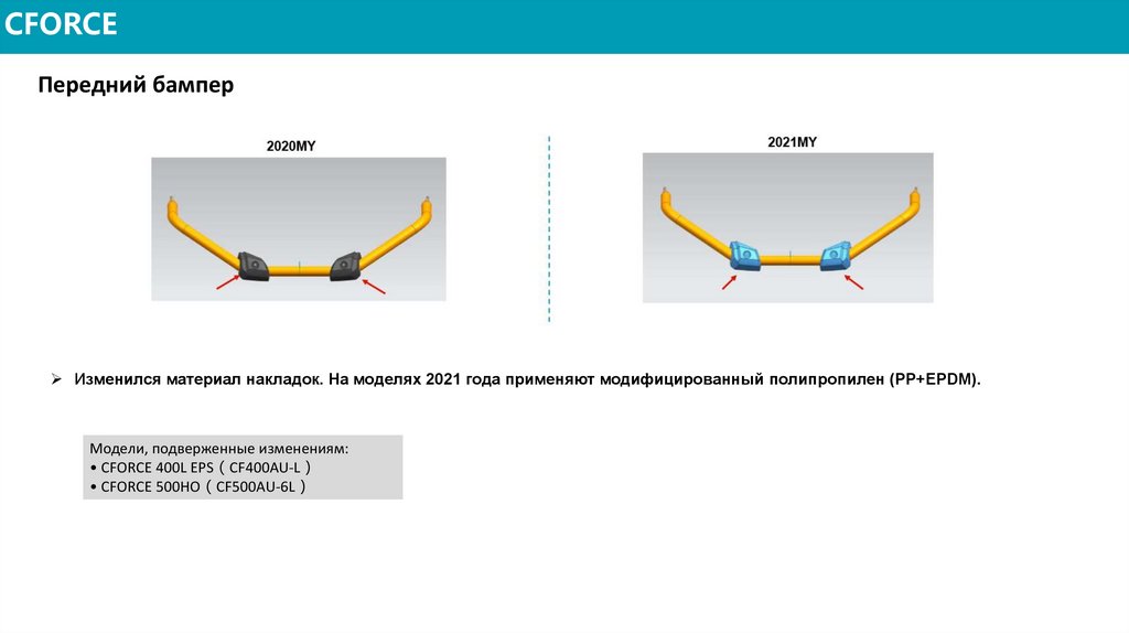 Изменился материал накладок. На моделях 2021 года применяют модифицированный полипропилен (PP+EPDM).