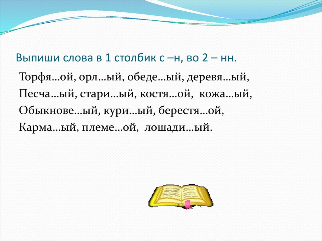 Выпиши слова в 1 столбик с –н, во 2 – нн.Торфя…ой, орл…ый, обеде…ый, деревя…ый,