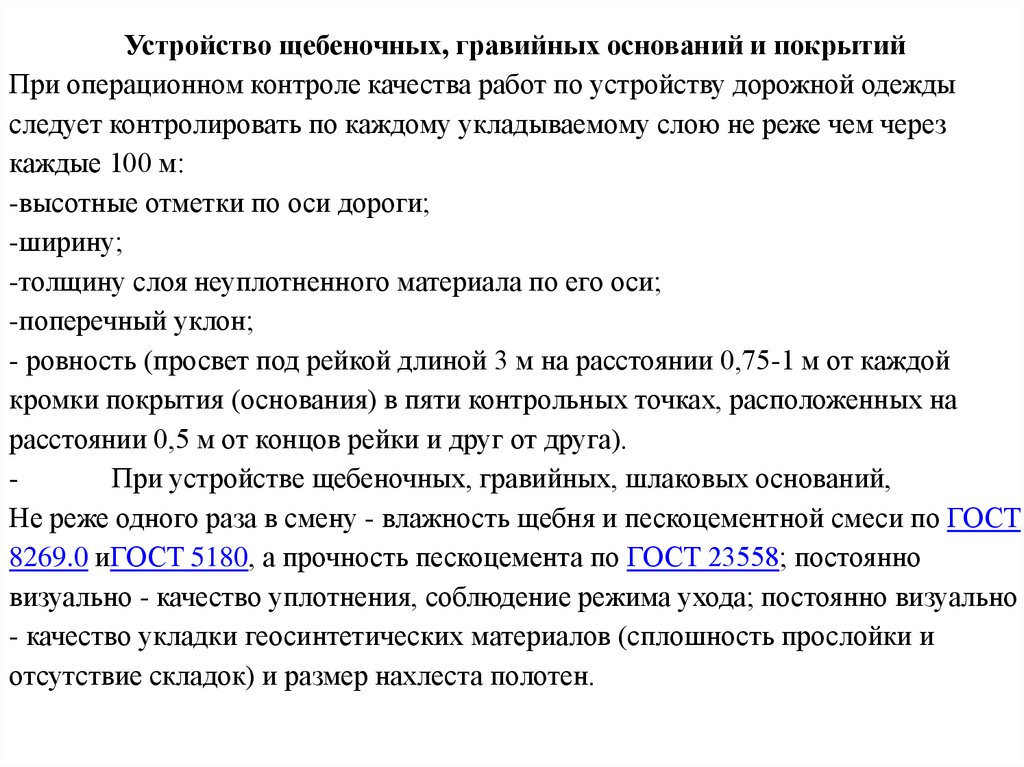 Устройство щебеночных, гравийных оснований и покрытийПри операционном контроле качества работ по устройству дорожной одежды