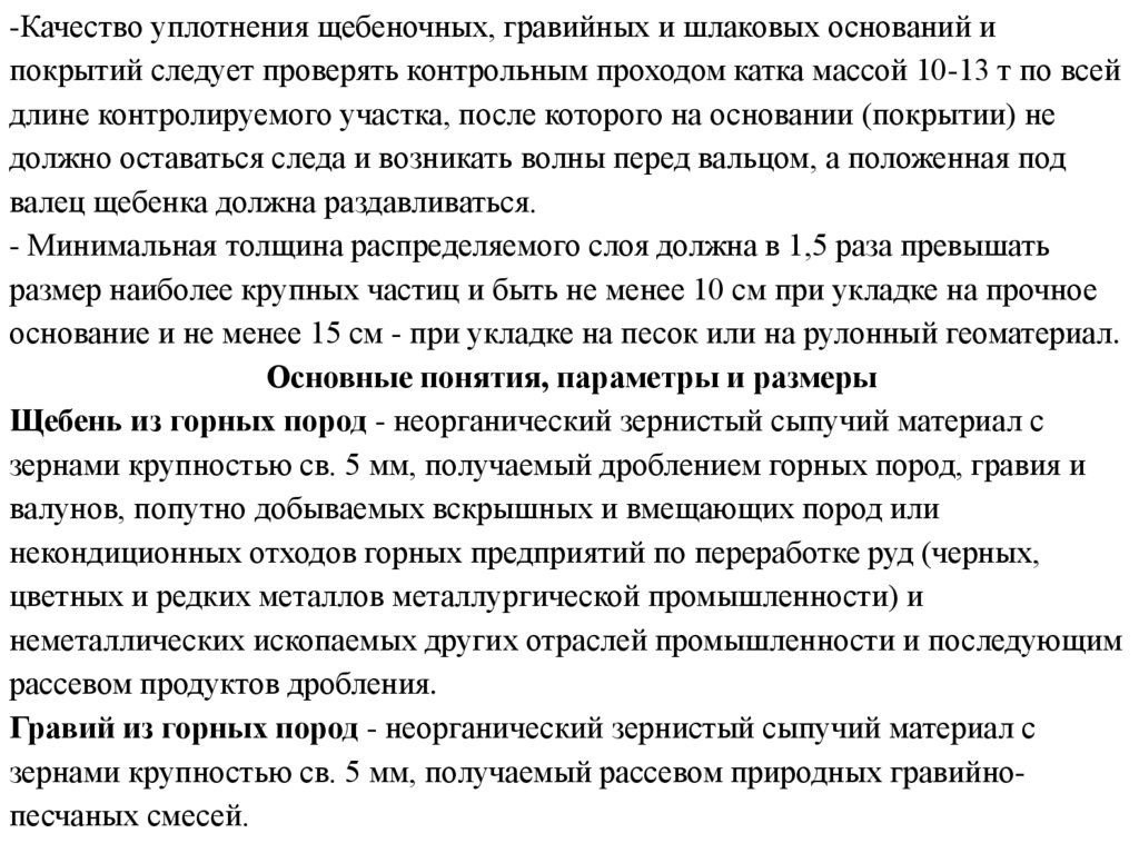 -Качество уплотнения щебеночных, гравийных и шлаковых оснований ипокрытий следует проверять контрольным проходом катка массой 10-13 т по всей