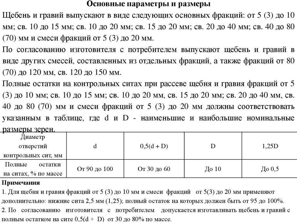 Основные параметры и размерыЩебень и гравий выпускают в виде следующих основных фракций: от 5 (3) до 10