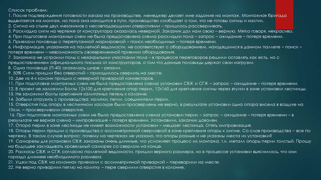 16. При подготовке монтажных схем не была предоставлена схема установки перил – запрос – ожидание – потеря времени – в
