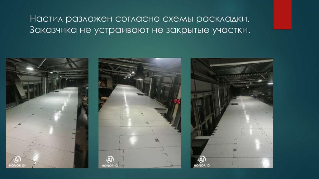 Настил разложен согласно схемы раскладки.Заказчика не устраивают не закрытые участки.