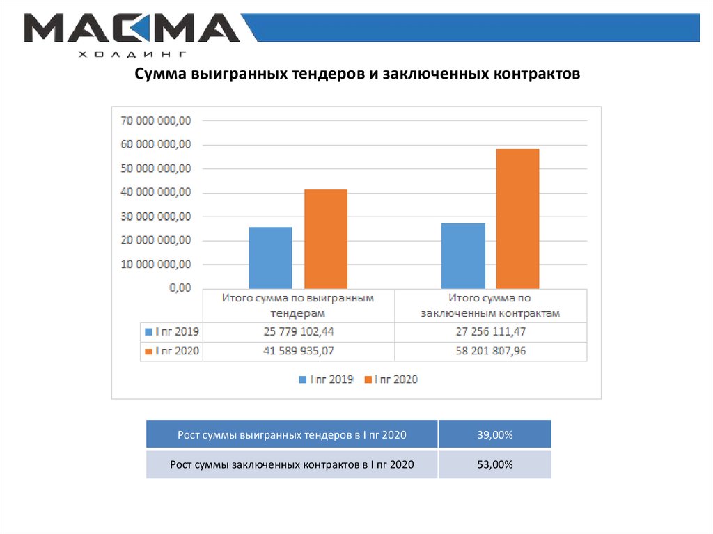 Сумма выигранных тендеров и заключенных контрактовРост суммы выигранных тендеров в I пг 2020