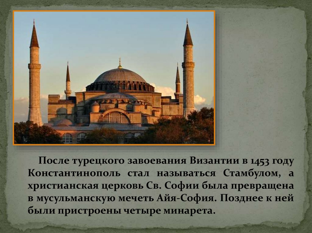 После турецкого завоевания Византии в 1453 годуКонстантинополь стал называться Стамбулом, а