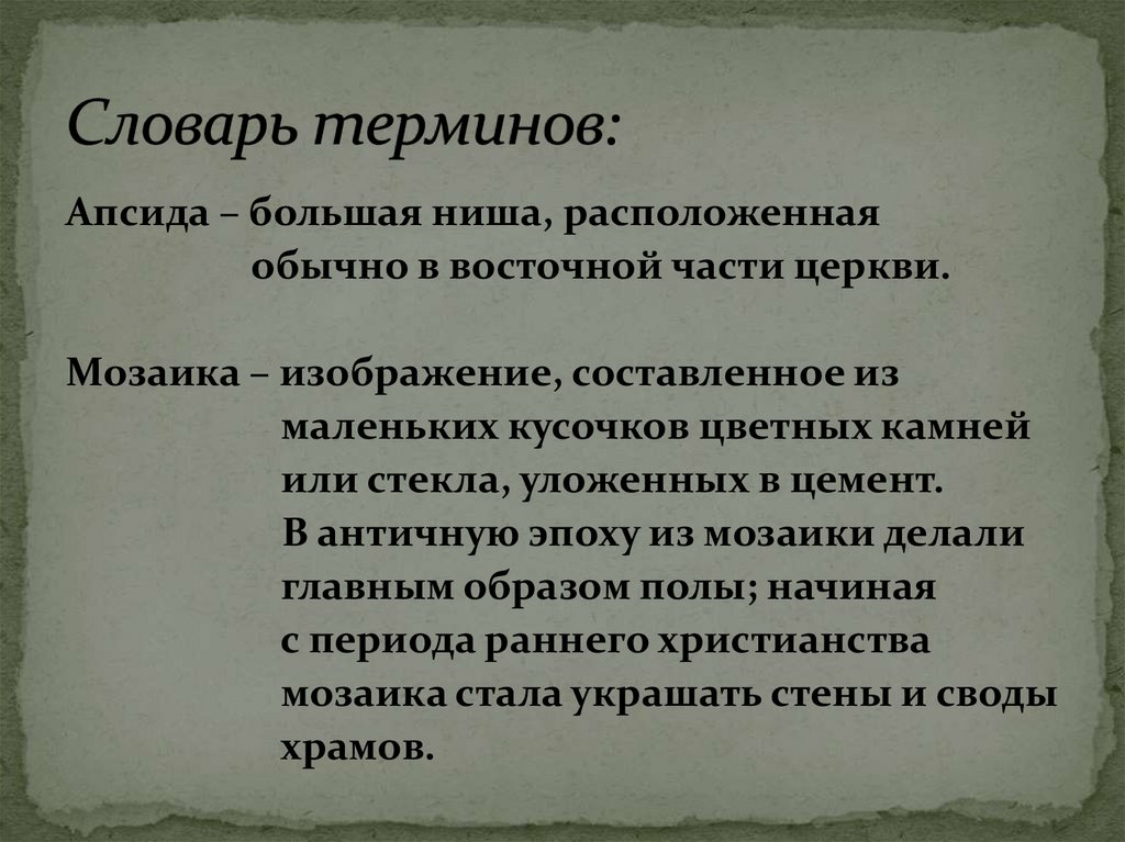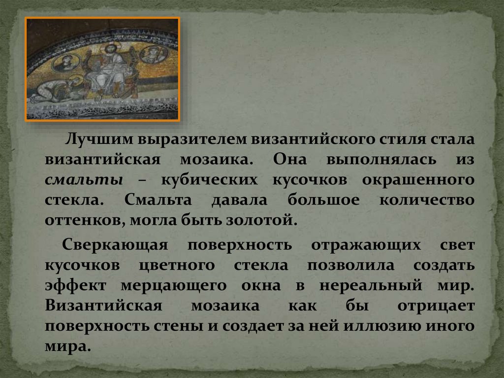 Лучшим выразителем византийского стиля сталавизантийская мозаика. Она выполнялась из