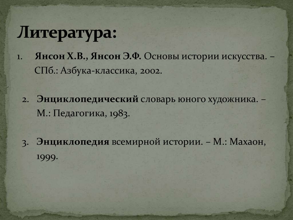 1.Янсон Х.В., Янсон Э.Ф. Основы истории искусства. –
