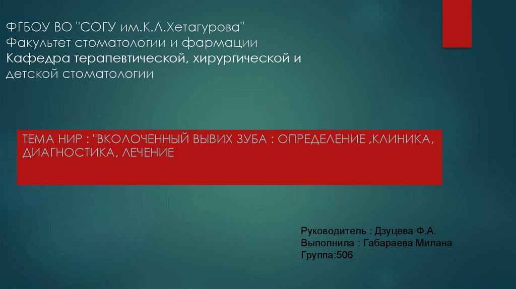 ТЕМА НИР : "ВКОЛОЧЕННЫЙ ВЫВИХ ЗУБА : ОПРЕДЕЛЕНИЕ ,КЛИНИКА,