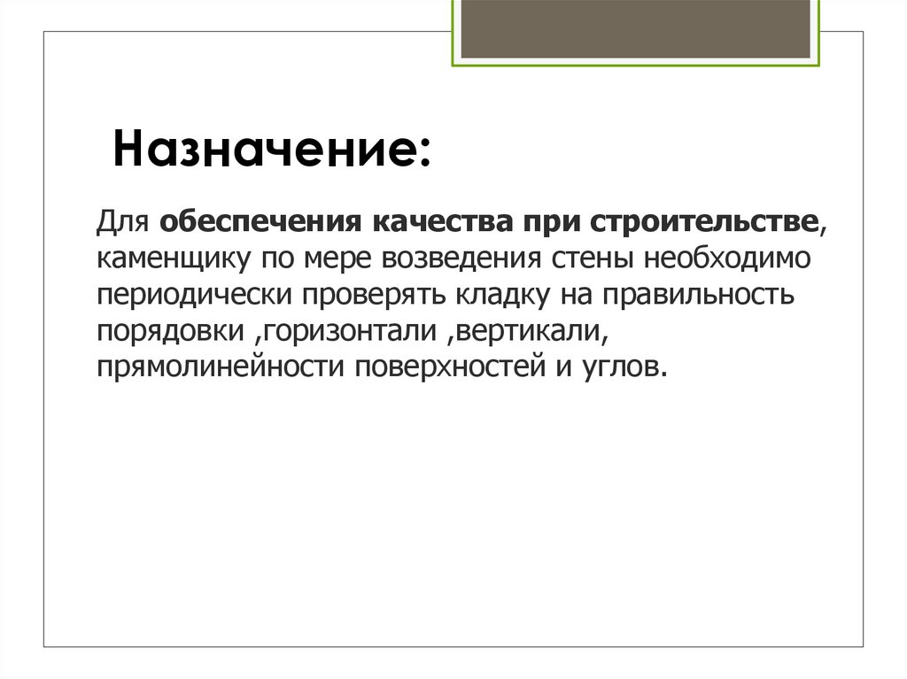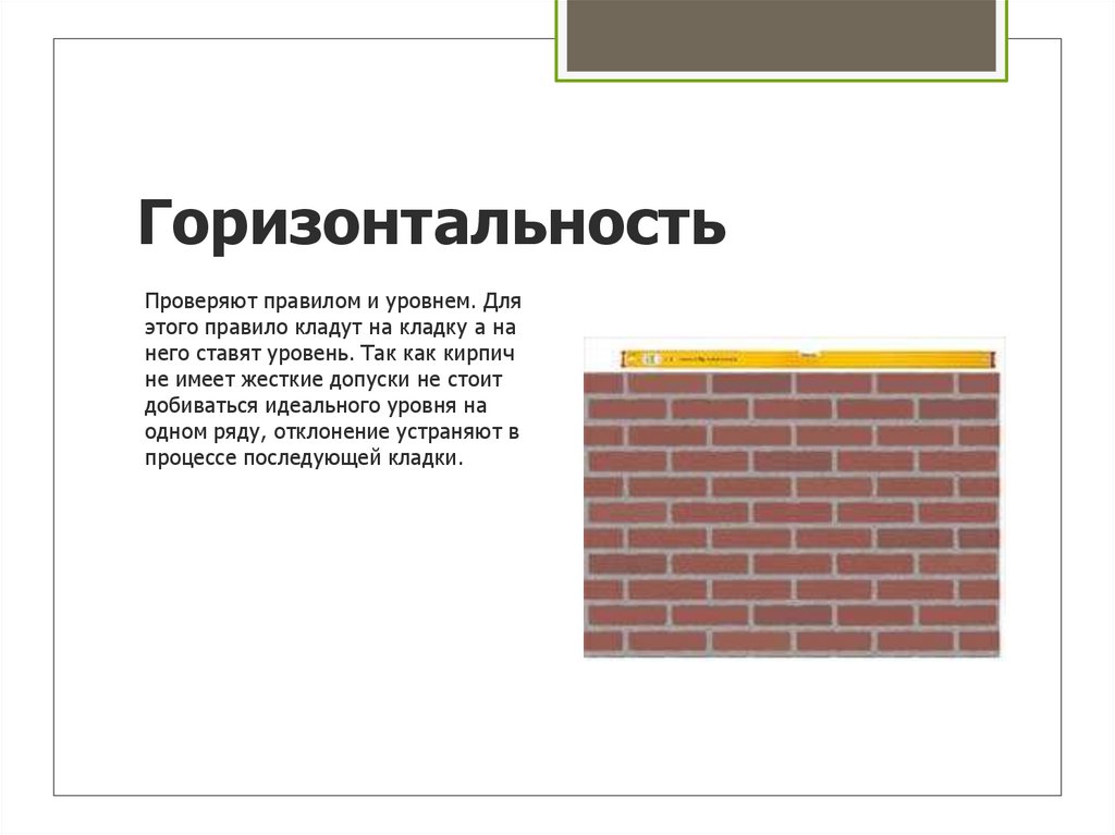 ГоризонтальностьПроверяют правилом и уровнем. Для