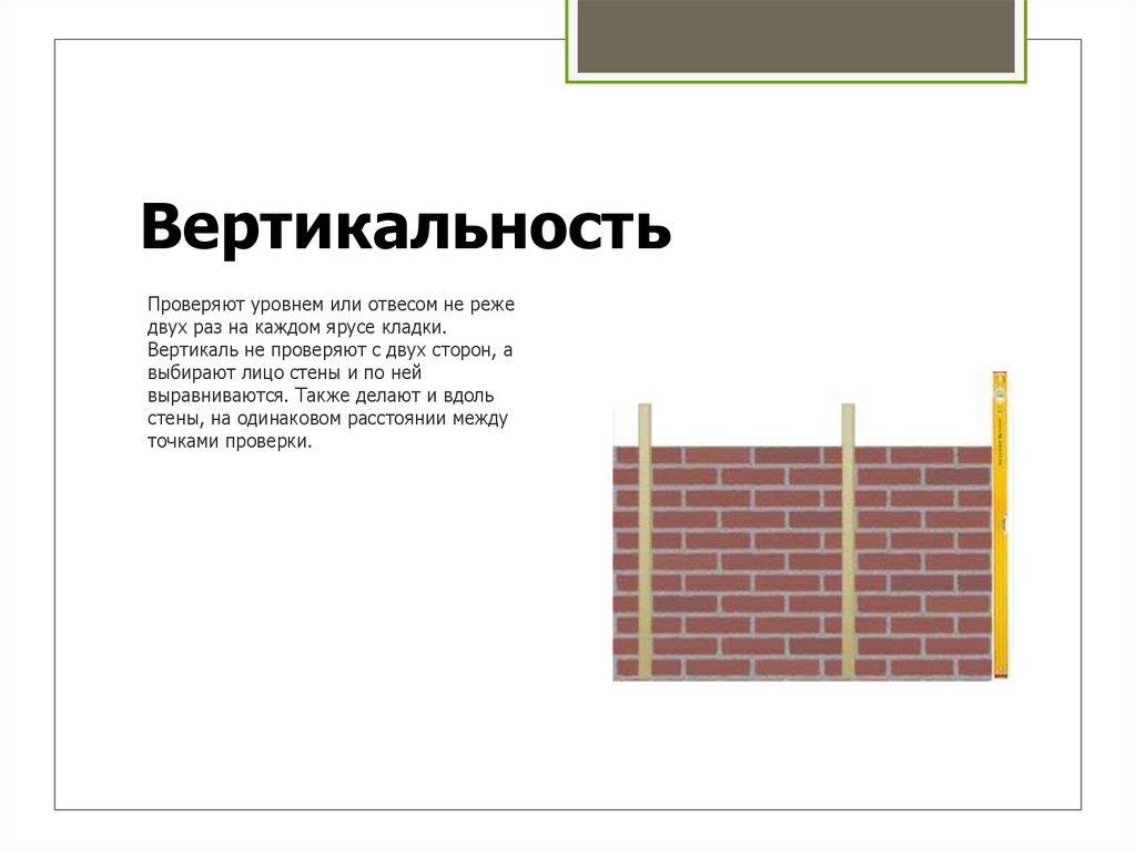ВертикальностьПроверяют уровнем или отвесом не реже