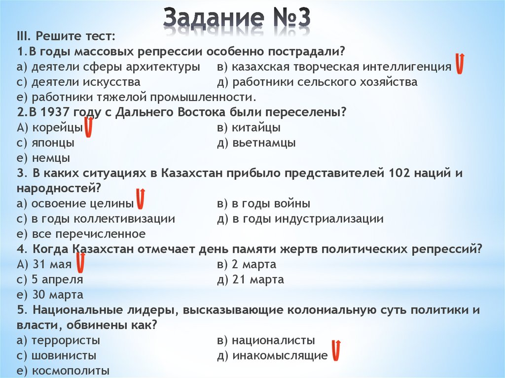 III. Решите тест:1.В годы массовых репрессии особенно пострадали?