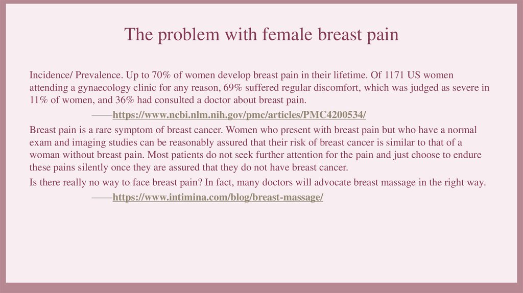 The problem with female breast painIncidence/ Prevalence. Up to 70% of women develop breast pain in their lifetime. Of 1171 US women