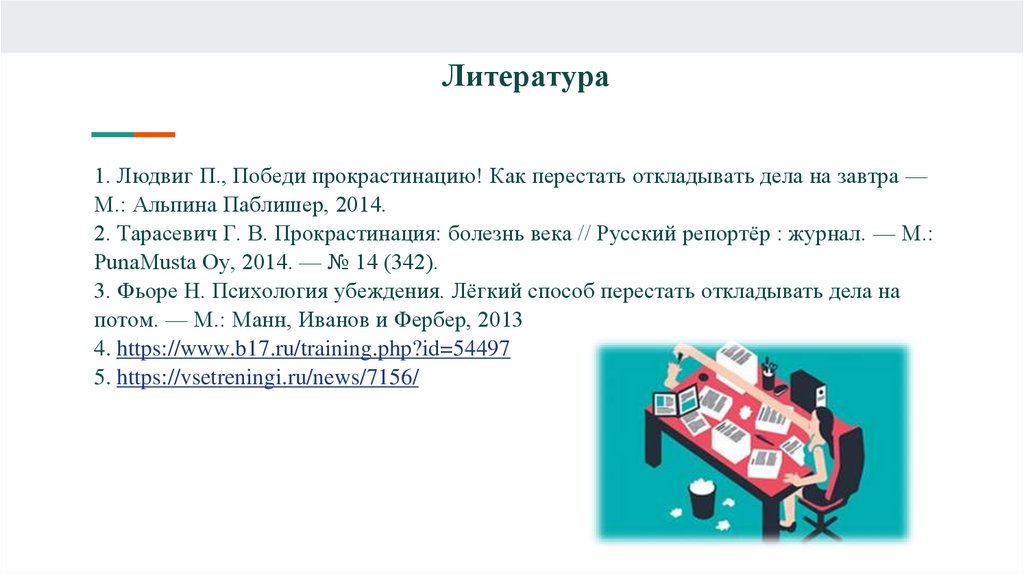 Литература1. Людвиг П., Победи прокрастинацию! Как перестать откладывать дела на завтра —