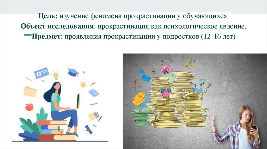 Цель: изучение феномена прокрастинации у обучающихся.Объект исследования: прокрастинация как психологическое явление.