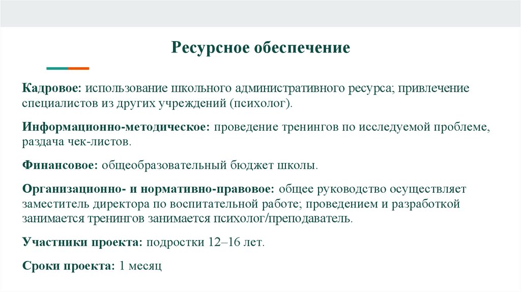 Ресурсное обеспечениеКадровое: использование школьного административного ресурса; привлечение