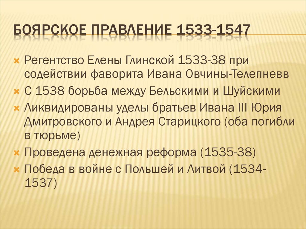 БОЯРСКОЕ ПРАВЛЕНИЕ 1533-1547Регентство Елены Глинской 1533-38 при