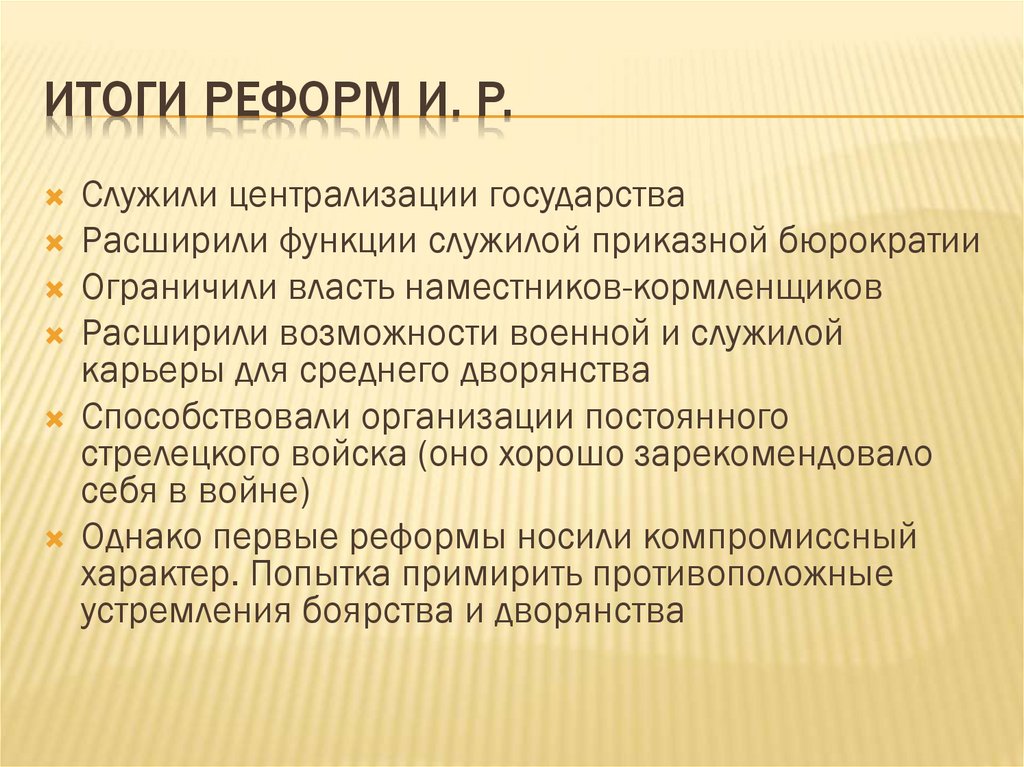 ИТОГИ РЕФОРМ И. Р.Служили централизации государства
