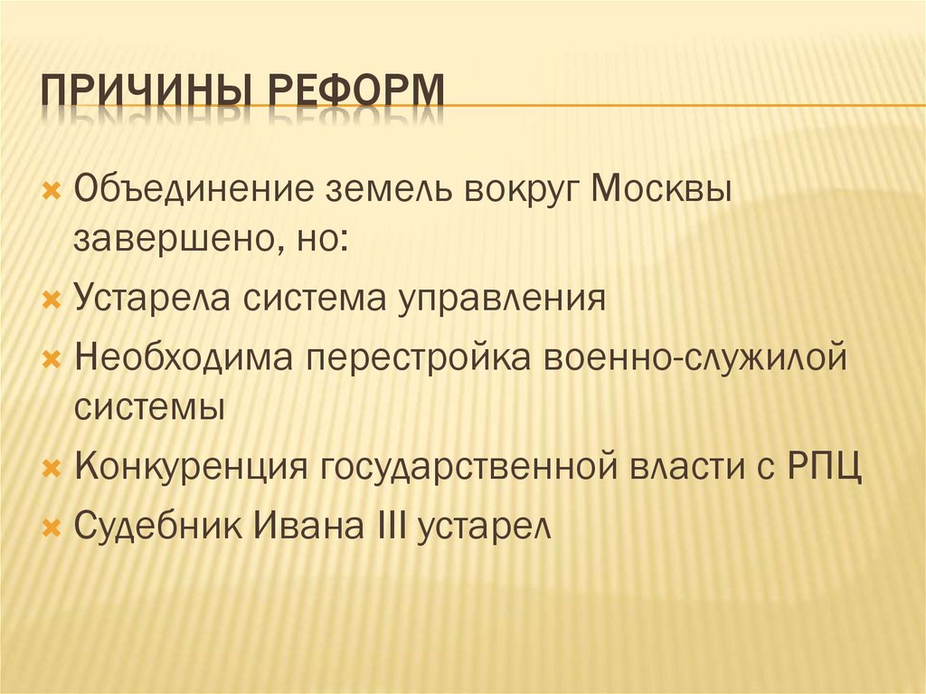 ПРИЧИНЫ РЕФОРМОбъединение земель вокруг Москвы