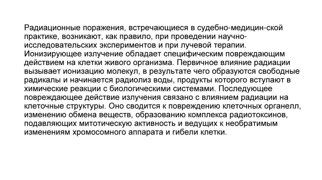 Радиационные поражения, встречающиеся в судебно-медицин-скойпрактике, возникают, как правило, при проведении научноисследовательских экспериментов и при лучевой терапии.