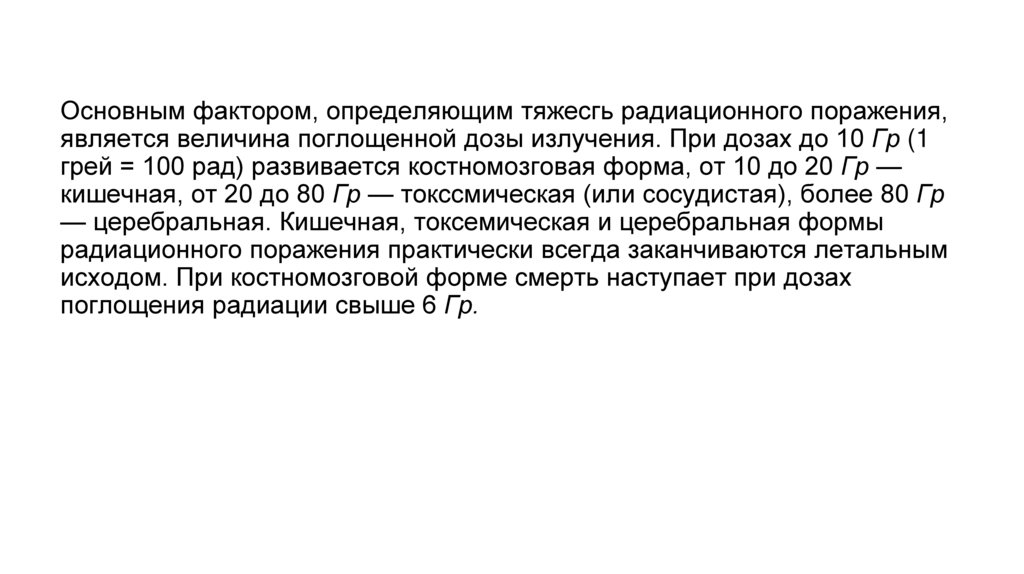 Основным фактором, определяющим тяжесгь радиационного поражения,является величина поглощенной дозы излучения. При дозах до 10 Гр (1